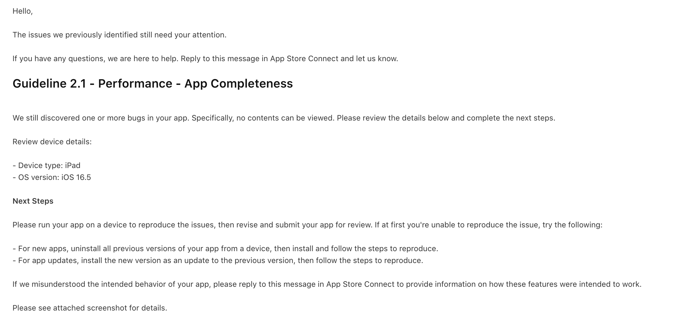 음.. 이렇게 버그가 어디서 어떤 문제가 발생하는지 알려주는지 놀랐다. 워낙 애플이 IT업계에서 악명이 높아서 겁먹고 있었다. 같이 회신한 스크린샷은 이랬다.