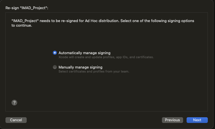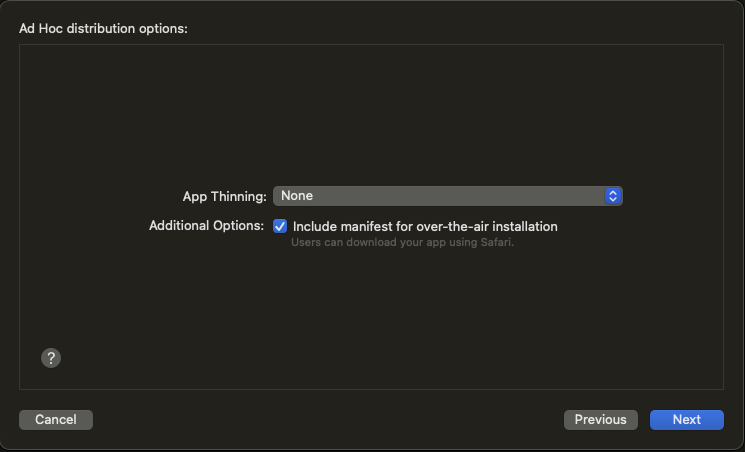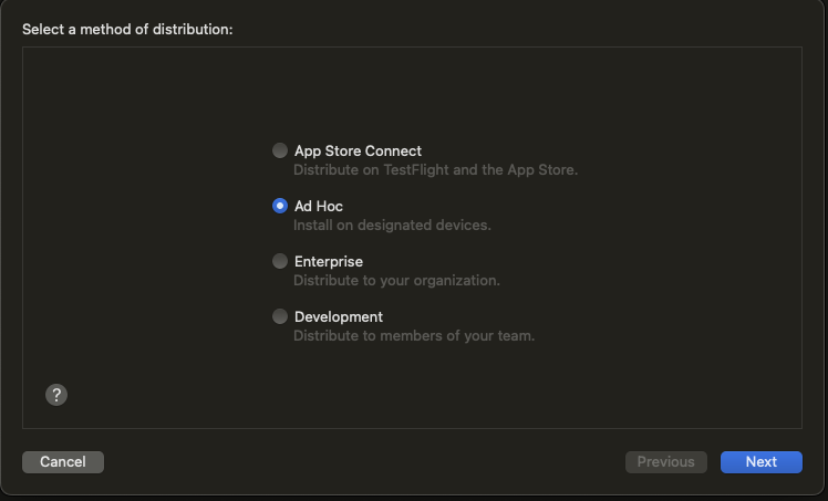 디폴트로 App Store Connect가 선택되있는데 이걸 Ad Hoc으로 선택한다.