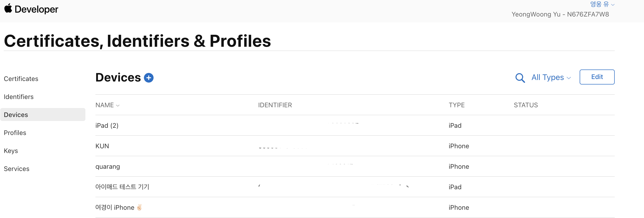 그것을 앱을 배포할 계정 디바이스에 추가한다. 이 과정을 거치는 이유는 xcode에서 앱을 빌드해서 실제 디바이스에서 테스트 하려면 직접적으로 맥북과 기기가 물리적으로 연결이 된 채로 빌드를 해야한다. 그렇게 되면 위 사진과 같이 decives목록에 추가가 되는 듯한데, 이 과정을 수동으로 하는 것이다.