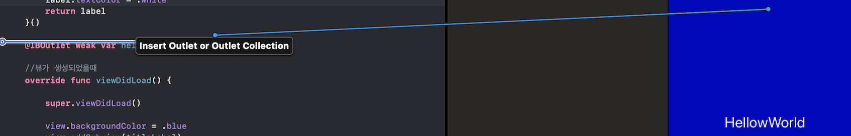 class ViewController: UIViewController { // 특정 UILabel 선언 var titleLabel:UILabel = { let label = UILabel() label.text = "HellowWorld" label.font = .boldSystemFont(ofSize: 50) label.textAlignment = .center label.textColor = .white return label }() override func viewDidLoad() { super.viewDidLoad() view.backgroundColor = .blue view.addSubview(titleLabel) titleLabel.translatesAutoresizingMaskIntoConstraints = false //위치고정 false titleLabel.centerXAnchor.constraint(equalTo: view.centerXAnchor).isActive = true //가로세로 중앙에 맞춤 titleLabel.centerYAnchor.constraint(equalTo: view.centerYAnchor).isActive = true } }참고 : SwiftUI의 짬으로 설명하자면 viewDidLoad()는 뷰가 나타났을때 실행되는 메서드이다. SwiftUI의 .onApear()와 같은 생명주기를 가진다.
