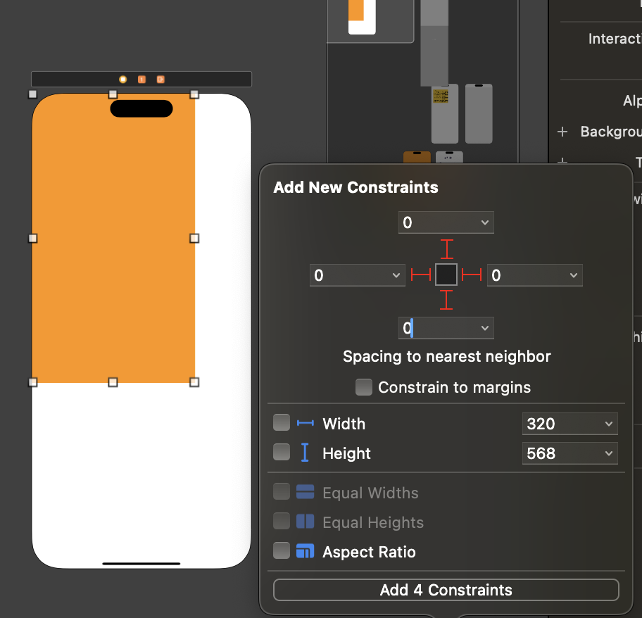 뷰를 선택하고 top,bottom,leading,trailing의 Anchor를 맞춰주고 spacing을 0으로 해준다.