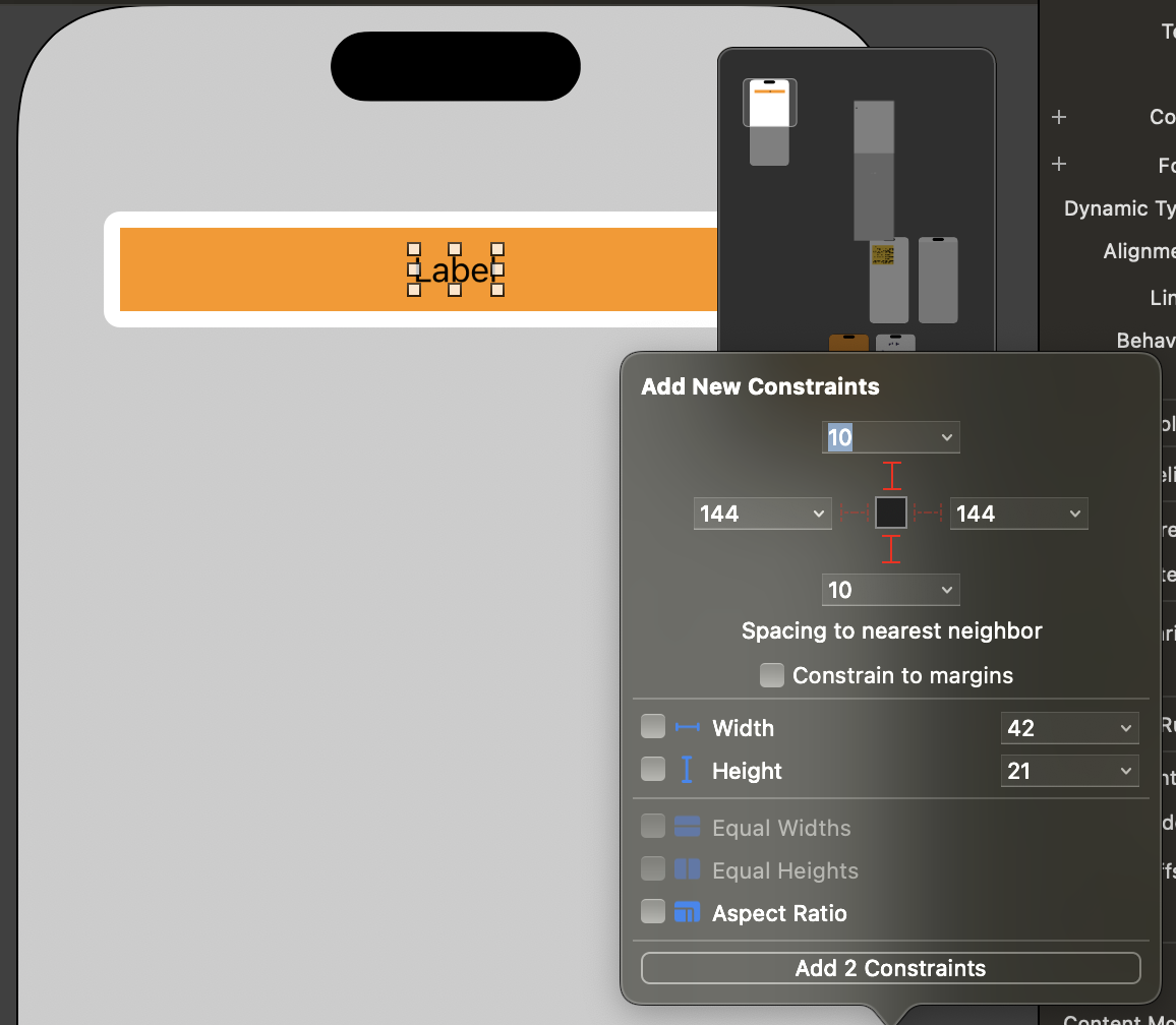 witdh,height를 고정으로 할당해주면 디바이스 크기에 상관없이 해당 뷰는 무조건적으로 디바이스 화면의 상,우측으로 맞춰지고 크기가 고정된다. 만약 이 작업없이 배치 시키고 디바이스의 위치를 확인해보면