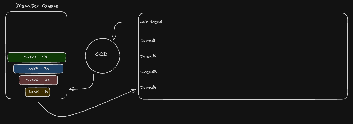 C나 C++같은 경우 스레드를 생성하고 관리하는 작업을 개발자가 직접 해줘야하지만, iOS에서는 우리가 하는 작업(task)들을 메인스레드가 아닌 다른 스레드로 옮길 수 있는 GCD 클래스를 제공한다. GCD는 비동기적업을 처리하기 위해 일단 작업을 적절한 순서대로 줄을 세우고 각각 할당을 해주기 수월하게 하기 위해 큐(Queue)를 사용한다.