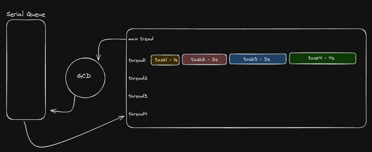 let concurrntQueue = DispatchQueue(label: "concurrntQueue",attributes: .concurrent) //concurrent - 병렬 let serialQueue = DispatchQueue(label: "SerialQueue") //serial - 직렬 // 명령어 라인 func performTask(taskNumber: Int) { print("Task \(taskNumber) 인출") sleep(1) print("Task \(taskNumber) 해석") sleep(1) print("Task \(taskNumber) 실행") sleep(1) print("Task \(taskNumber) 저장") sleep(1) } // 병렬 처리할 작업 개수 let numberOfTasks = 5 //1 - serial + sync print(Thread.main) for i in 1...numberOfTasks { serialQueue.sync { performTask(taskNumber: i) } } print(Thread.main) //2 - concurrency + sync print(Thread.main) for i in 1...numberOfTasks { concurrntQueue.sync { performTask(taskNumber: i) } } print(Thread.main) //3 - serial + async print(Thread.main) for i in 1...numberOfTasks { serialQueue.async { performTask(taskNumber: i) } } print(Thread.main) //4 - concurrency + async print(Thread.main) for i in 1...numberOfTasks { concurrntQueue.async { performTask(taskNumber: i) } } print(Thread.main)손수 작성한 코드다. 각각의 큐를 생성하고 작업과 루프를 각각의 조합별로 만들었다. 한번 자세히 생각해보자.