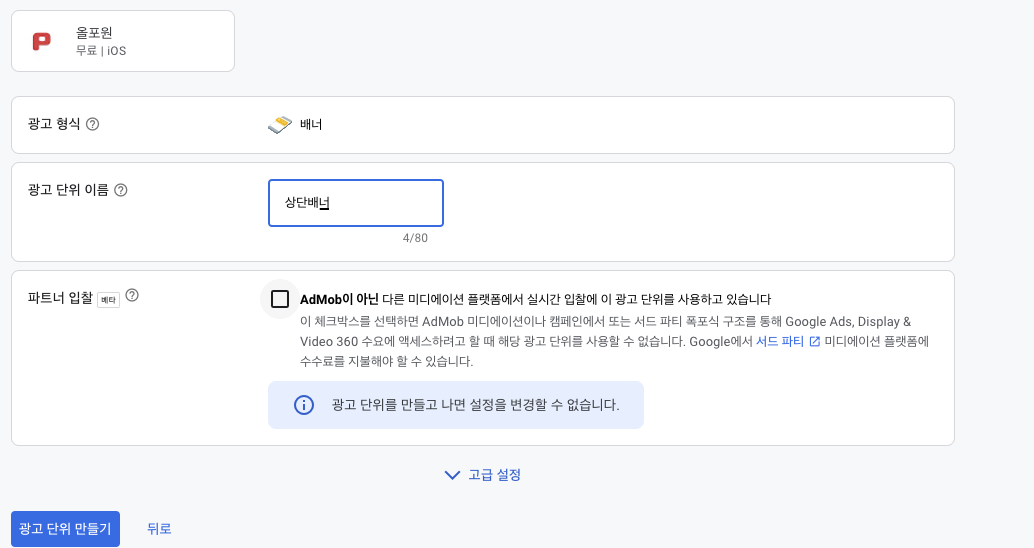 형식을 선택하고 광고 단위 이름을 작성한다.