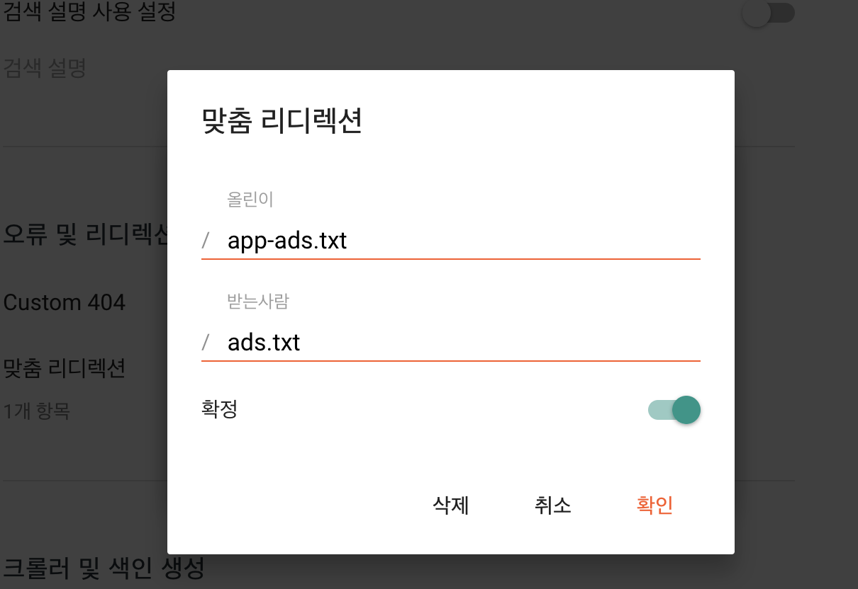 다음 설정 > 오류 및 리디렉션 > 맞춤 리디렉션을 들어가서 해당 txt파일에 접근할 수 있도록 설정한다.