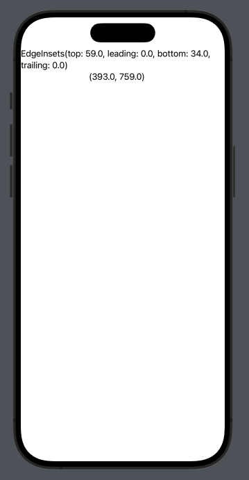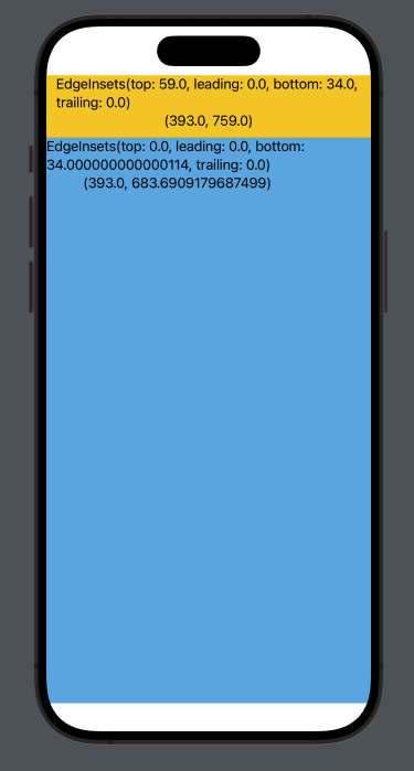 geometry.safeAreaInsets.top // 최상단 으로 부터의 거리 geometry.safeAreaInsets.bottom //최히단 으로 부터의 거리 geometry.safeAreaInsets.leading //좌측 으로 부터의 거리 geometry.safeAreaInsets.trailing //우측 으로 부터의 거리그래서 지금은 top - 59.0, bottom - 34.0이 띄워져 있지만 만약. ignoresSafeArea()을 해당 컨테이너에 적용할 경우