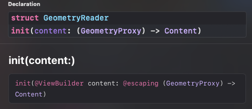 GeometryReader는 GeometryProxy를 파아미터로 받는 클로져를 반환하는데, 여기서 GeometryProxy는 GeometryReader 내부에서 사용되는 뷰의 기하학적 정보를 포함하고 있다.